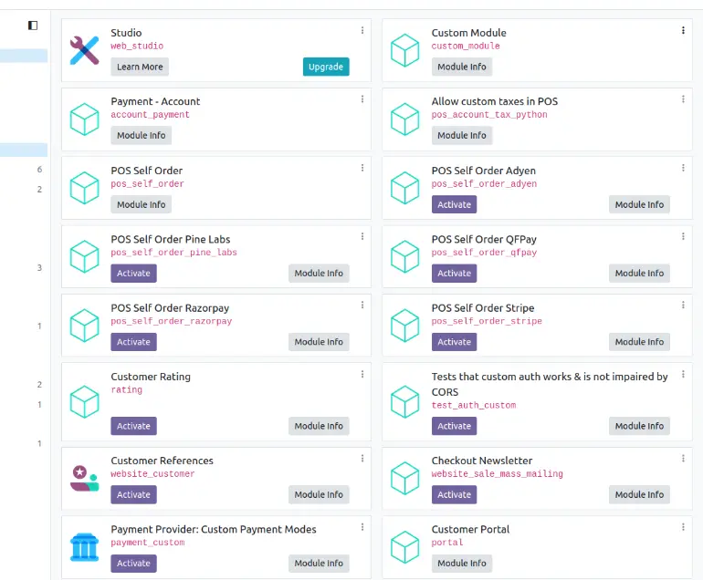 • Access to the Odoo addons directory. The addons path can be found in the Odoo configuration file (odoo.conf) or by checking the running Odoo service in the terminal. The addons path is defined in the configuration file and includes directories such as /odoo/addons and /odoo/custom_addons, where Odoo modules are stored.